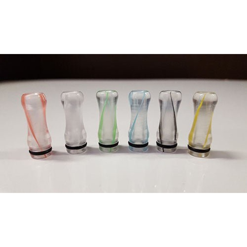 This is a standard 510 drip tip made from acrylic. Clear with a coloured swirl pattern.