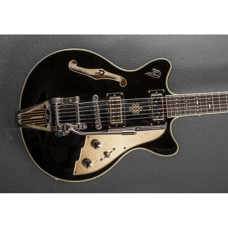 Black, Gloss finish, Semi-hollow body with the sustain block, Laminated Spruce top with the F hole, Laminated Flame Maple back and sides, Medium D shaped Maple neck, Bound 12" radius Indian Rosewood fingerboard with the Morse code inlays and jumbo frets, 2