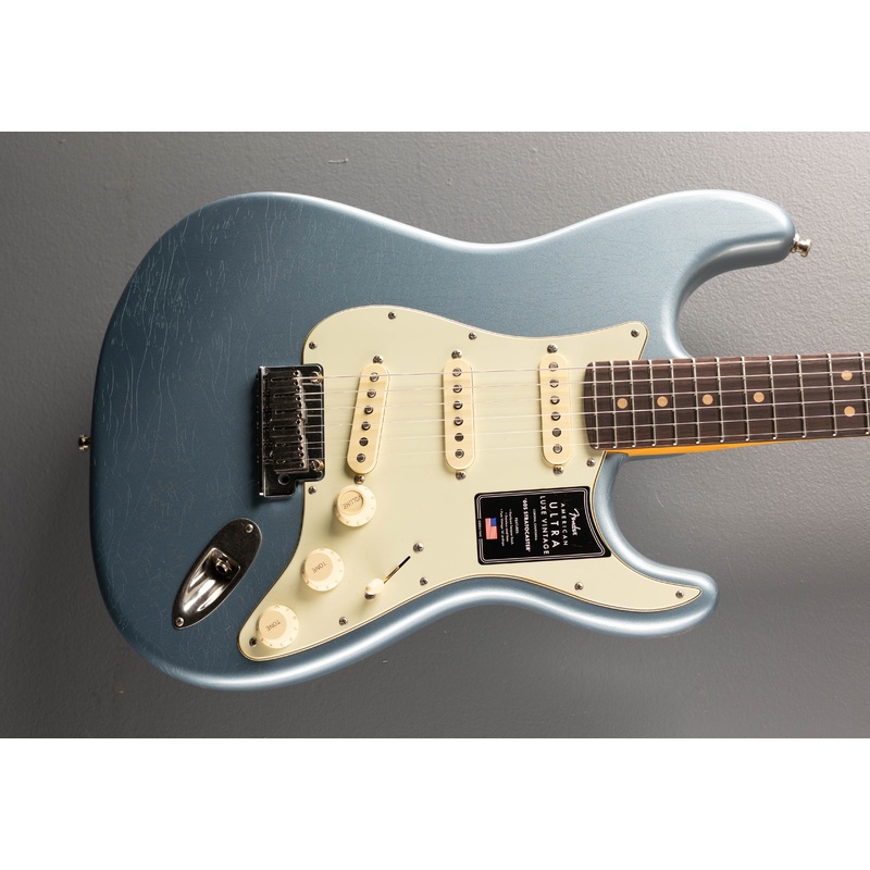 Ice Blue Metallic, Heirloom Nitrocellulose Lacquer Finish, Alder body with Ultra contours and tapered neck heel, 10″-14″ compound radius Rosewood fingerboard with Clay Dot inlays and Medium Jumbo Stainless Steel frets on a Modern D shaped Quartersawn Maple neck with Luminlay side dots, 25.5″ scale length, 1.685″ nut width, Pure Vintage ’61 Single-Coil Strat Neck/Middle/Bridge pickups, Master Volume (S-1 Switch), Tone 1-2, five position blade switching,2-Point Deluxe Synchronized Tremolo with Pop-In Arm, Deluxe Cast/Sealed Locking tuners, 7.6 pounds, comes with hardshell case.