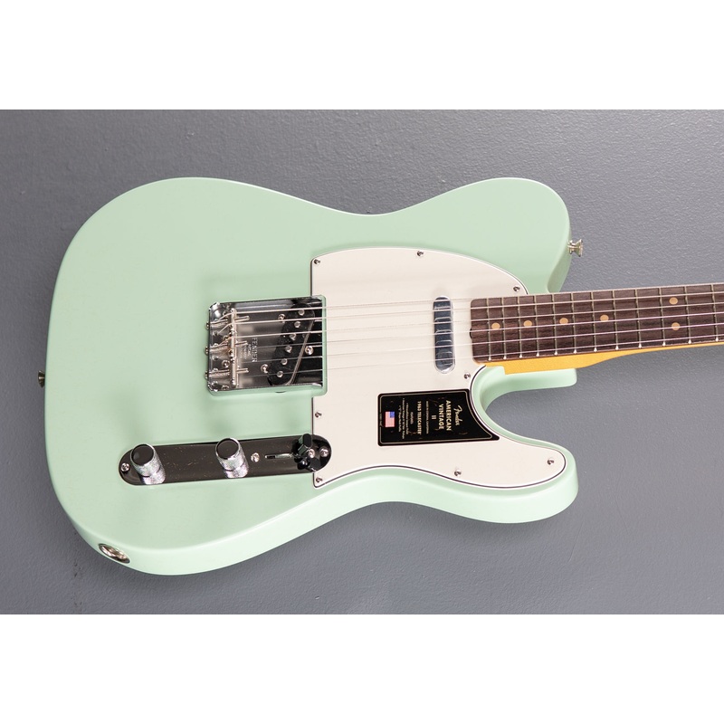 Surf Green, Alder body, Gloss nitrocellulose lacquer finish, 1963 C shaped Maple neck with a 7.25″ radius round laminated Rosewood fingerboard and vintage tall frets, 25.5″ scale length, 1.650″ nut width, Fender Pure Vintage ’63 single coil Tele pickups, 3-way switching with the master volume and tone controls, Pure Vintage string thru body Tele bridge with the three threaded steel barrel saddles, Pure Vintage single line Fender deluxe tuners, 7.5 pounds, With hardshell case.