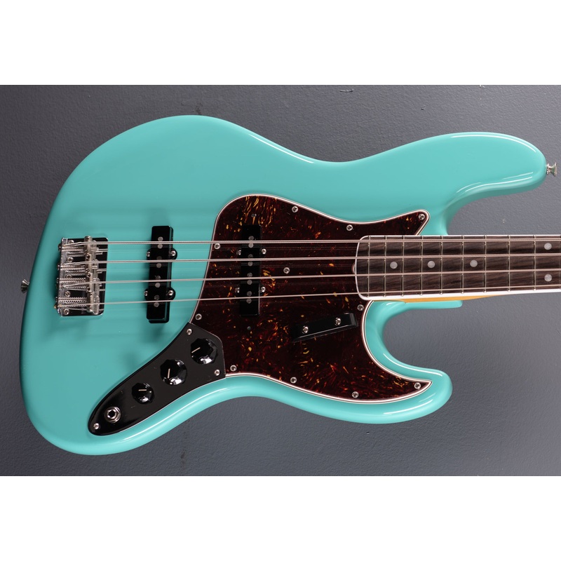 Sea Foam Green, Alder body, Gloss nitrocellulose lacquer finish, 1966 U shaped Maple neck with a bound 7.25″ radius round laminatedRosewood fingerboard and vintage tall frets, 34″ scale length, 1.5″ nut width, Pure Vintage ’66 single coil Jazz Bass pickups with the volume/volume/tone controls,Pure Vintage bridge with the threaded steel saddles, Pure Vintagelollipop tuners, 8.8 pounds,comes with hardshell case.
