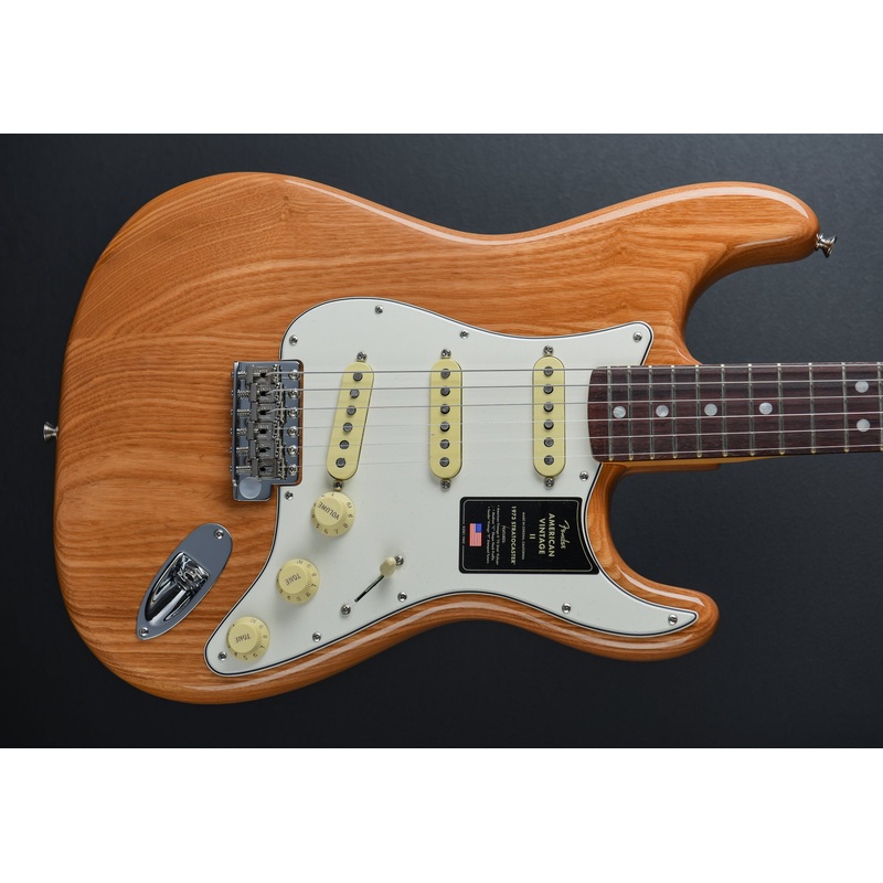 The American Vintage II 1973 Stratocaster exudes the spirit of the era and is outfitted with a trio of Pure Vintage ’73 staggered pole pickups, a large headstock with dual string trees, a convenient Bullet style truss rod nut and a three-bolt neck plate with Micro-Tilt mechanism. The C-shape maple neck plays like a dream with a 7.25 radius rosewood or maple fingerboard and vintage tall frets. The guitar is offered in three classic colors over ash: Aged Natural, Lake Placid Blue and Mocha, the latter being the first custom color ever to feature a black pickguard on a Strat. Additional features include vintage-style F stamped tuners and a synchronized tremolo with bent steel saddles and cold rolled steel block.