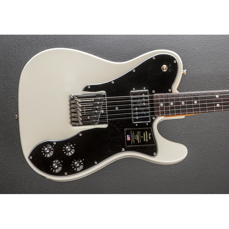 Olympic White, Alder body, Gloss polyurethane finish, 1977 C shaped Maple neck with a 7.25″ radius Rosewood fingerboard and vintage tall frets, 25.5″ scale length, 1.650″ nut width,Pure Vintage ’77 single coil Tele bridge andAuthentic CuNiFe Wide Range humbucking neck pickups, 3-way switching with the volume and tone controls for each pickup,Pure Vintage string thru body Tele bridge with the slotted steel barrel saddles, Pure Vintage Fender F stamped tuners, 8.0 pounds, With hardshell case