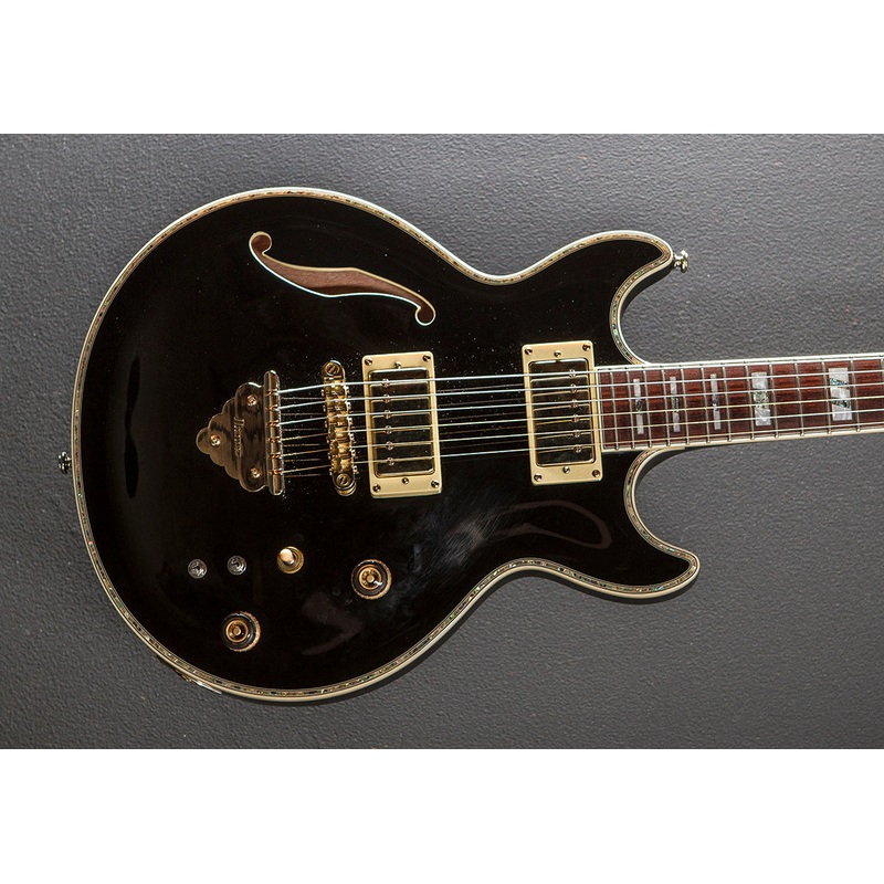 Black, Arched Maple top with the F hole, Semi-hollow Okoume body with the center block, AR shaped three piece Maple neck with a bound 12" radiusJatoba fingerboard and medium frets, 24.75" scale length, 1 11/16th" nut width, Ibanez Super 58 humbucking bridg