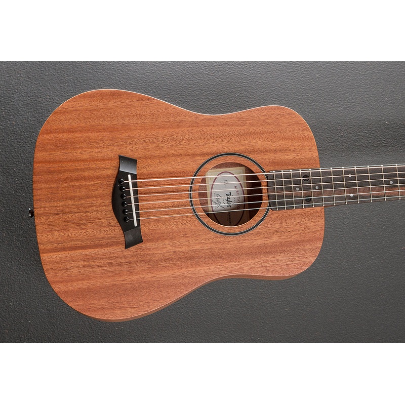 “The Baby Taylor has long been a gateway for new learners into the world of the acoustic guitar, and with the all-mahogany BT2, players now have another option in both look and sound. A solid top gives this three-quarter-scale guitar a surprising sonic punch for its size, and the slim, comfortable neck makes it easier to hold down the strings to form notes and chords. An ideal beginner’s or kid’s guitar but also great for experienced players who want a decent-sounding travel guitar, the BT2 is a fun-sized blend of musical excitement and utility. It includes a soft gig bag.”