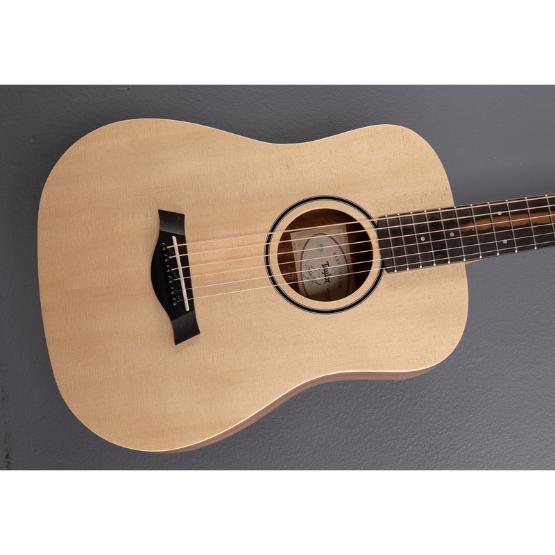 “The guitar that set the standard for the travel guitar market, the enduringly popular Baby Taylor makes a great musical companion. Portable, playable and affordable, the Baby features a solid spruce top and yields impressive volume and tone for its compact, three-quarter-size scale. Its the perfect travel mate, its a great choice for kids taking lessons, and artists from Lindsey Buckingham to Bono to Taylor Swift have used one for songwriting, recording and performing. With its unique dimensions and tonal personality, players have used it in other creative ways, from high-stringing it to setting it up to play lap slide to adding a capo to evoke mandolin-like sounds. The Baby includes a Taylor gig bag for easy portability.”