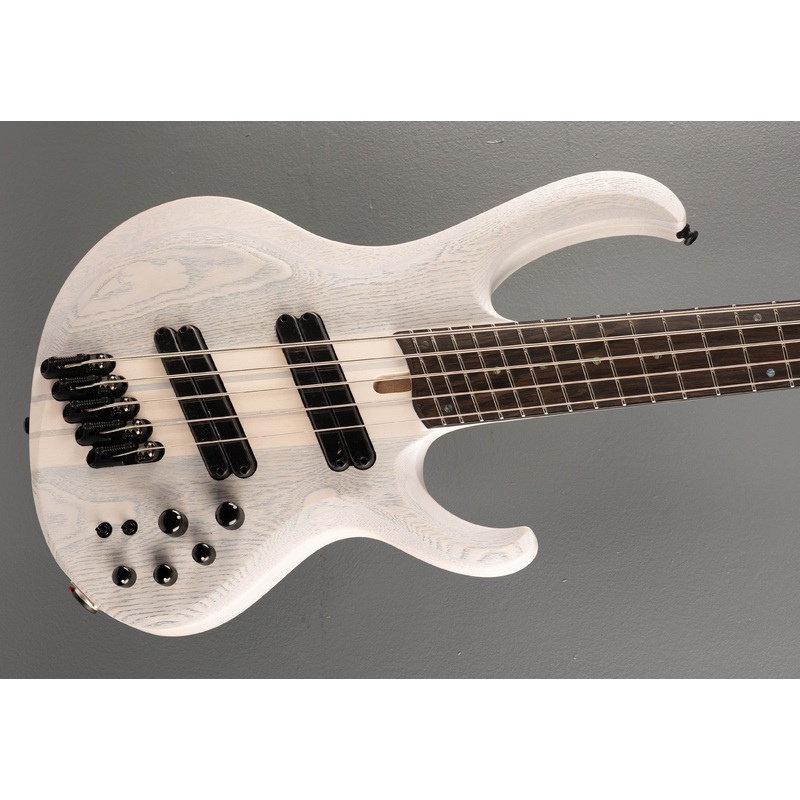 Transparent White Flat, Ash top with Okoume/Ash wing body, Bound 15.75" radius Panga Panga fingerboard with Abalone dot inlays and Medium Stainless Steel frets on a BTB5 shaped 5pc Maple/Walnut Neck with Graphite reinforcement rods, 37"-35" multi scale len