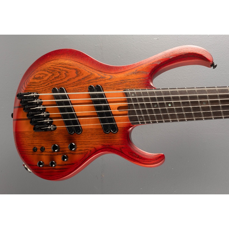 Brown Topaz Burst Flat, Ash top with Okoume/Ash wing body, Bound 15.75" radius Panga Panga fingerboard with Abalone dot inlays and Medium Stainless Steel frets on a BTB6 shaped 5pc Maple/Walnut Neck with Graphite reinforcement rods, 37"-34" multi scale len