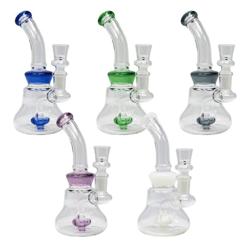 A simple yet unique design for beginners and avid smokers alike! Standing at a manageable 6.5" tall, this simple glass piece is utilizes a bent neck design that doubles as a splash guard that prevents water from splashing through the piece. Thus, creates a