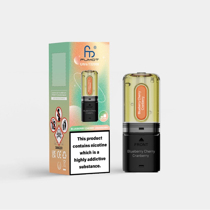 Fumot Ultra T32000 Pods Blueberry Cherry Cranberry Enjoy up to 16,000 puffs of vibrant flavour. Each pod includes 2ml + 10ml of e-liquid, combining juicy blueberry, tart cherry, and tangy cranberry in a rich berry fusion.