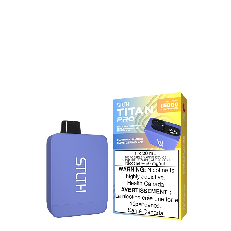 Blueberry Lemon Ice STLTH TITAN PRO DisposableJuicy blueberries infused with a zesty splash of squeezed lemon with an icy finish. ______ STLTH TITAN - DUAL POWER - TWICE THE HIT - WITH LED SCREEN 1 Box contains 1 Disposable Device 20mL of E-Liquid Adjustab