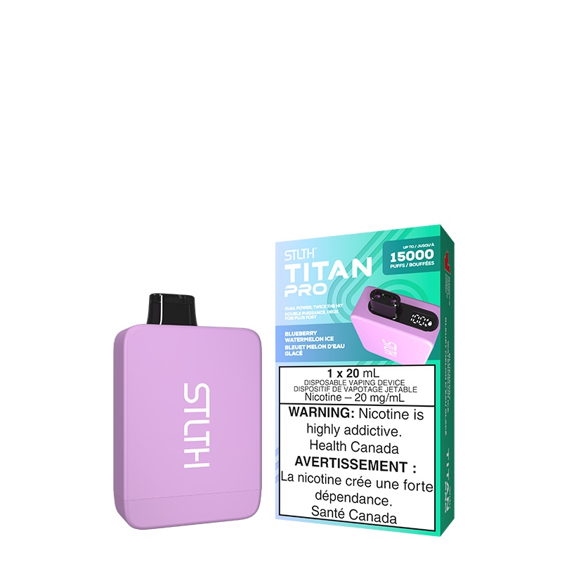 Blueberry Watermelon Ice STLTH TITAN PRO DisposableA cooling fusion of juicy blueberries and refreshing watermelon, creating a delightful icy flavour with fruity sweetness. ______ STLTH TITAN - DUAL POWER - TWICE THE HIT - WITH LED SCREEN 1 Box contains 1
