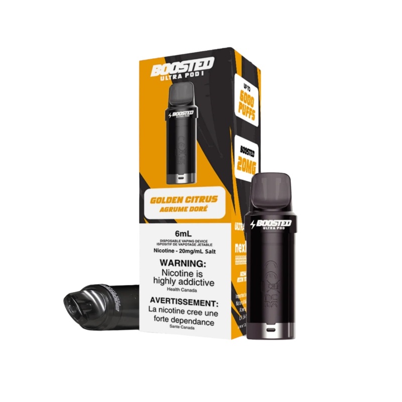 Boosted Pods ULTRA - Golden Citrus - A bright and zesty blend of sun-kissed citrus fruits. Boosted Pods ULTRA Key Features: New Design with Leak proof technology Classic Boosted Nicotine OLED Screen Vibration Indicator Boosted Pods ULTRA Specifications: Up