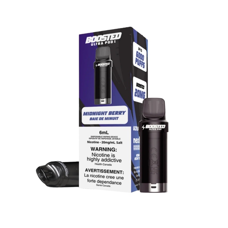 Boosted Pods ULTRA - Midnight Berry - Luscious blend of ripe mixed berries. Boosted Pods ULTRA Key Features: New Design with Leak proof technology Classic Boosted Nicotine OLED Screen Vibration Indicator Boosted Pods ULTRA Specifications: Up to 6,000 puffs