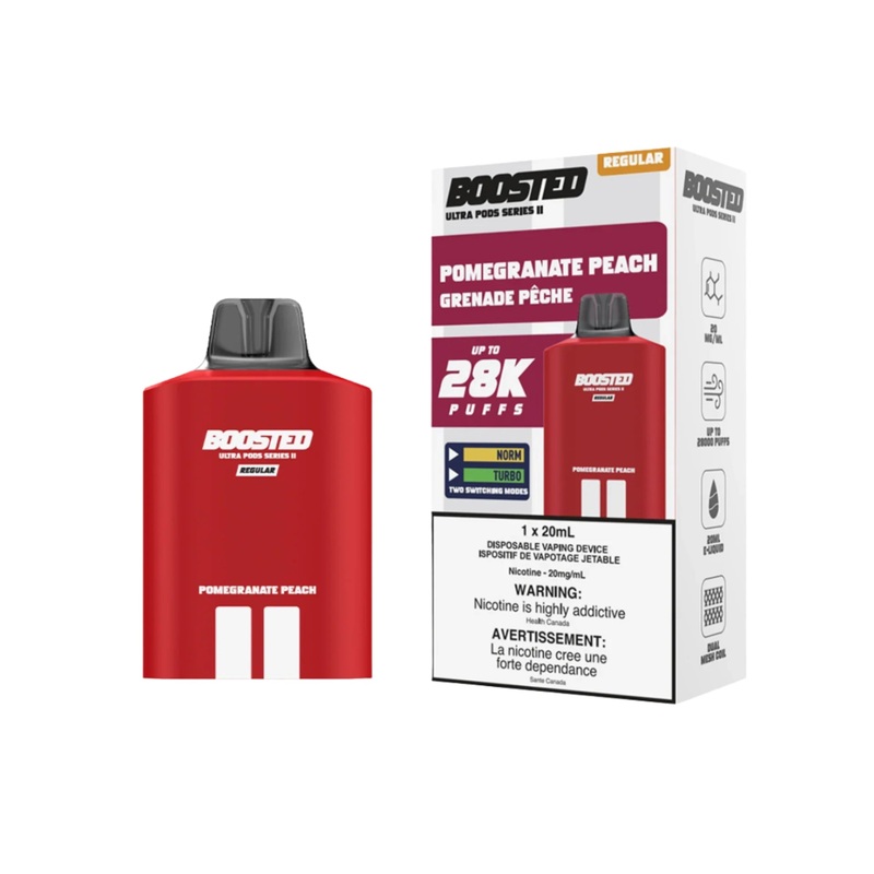 Boosted Ultra Series II - Pomegranate Peach - A luscious mix of tart pomegranate and juicy peach for a rich, fruity experience. Boosted Ultra Series II Key Features: New Design with Leak proof technology Classic Boosted Nicotine Adjustable airflow OLED Scr