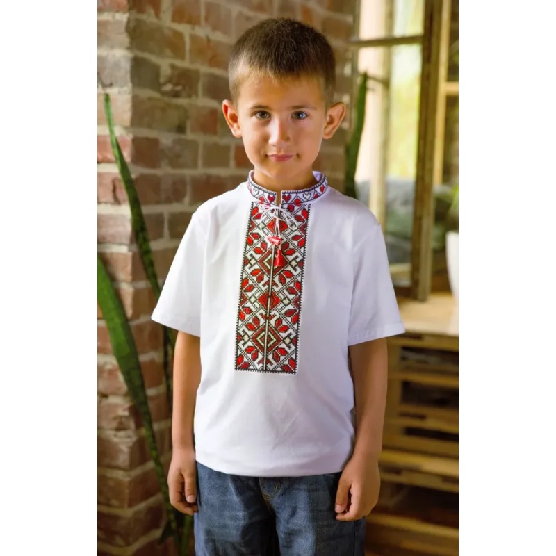 Podilska red embroidered shirt for a boy with an embroidered stand-up collar, short sleeves Podilska knitted embroidered shirt combines the traditions of antiquity and modern fashion trends. Red pattern with the addition of black harmoniously and brightly