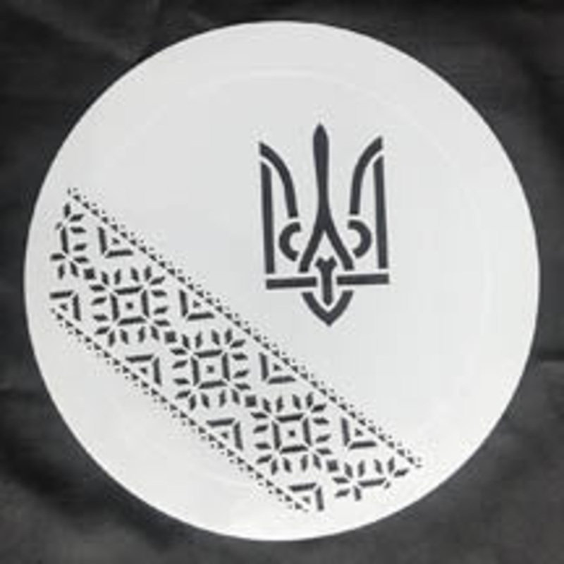 Reusable, flexible mylar is washable and food safe. Impress your friends by making a cake or salad with a tryzub and embroidery design.