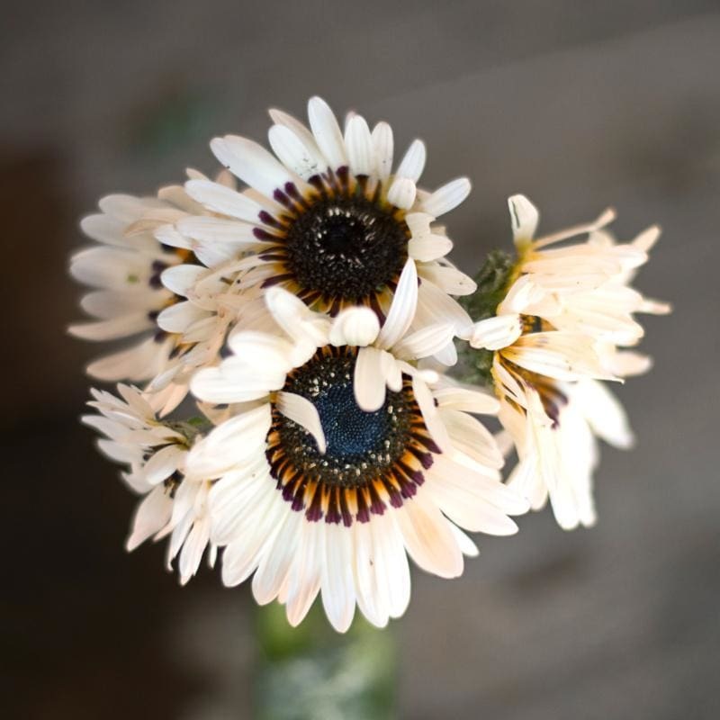 The 16 to 24-inch tall plants are covered with unusual daisy like 3-inch blooms which are white on the outside edge of the petals. Moving toward the center there is a ring of purple, then a ring of orange, with an almost black focal point. Foliage is a lov