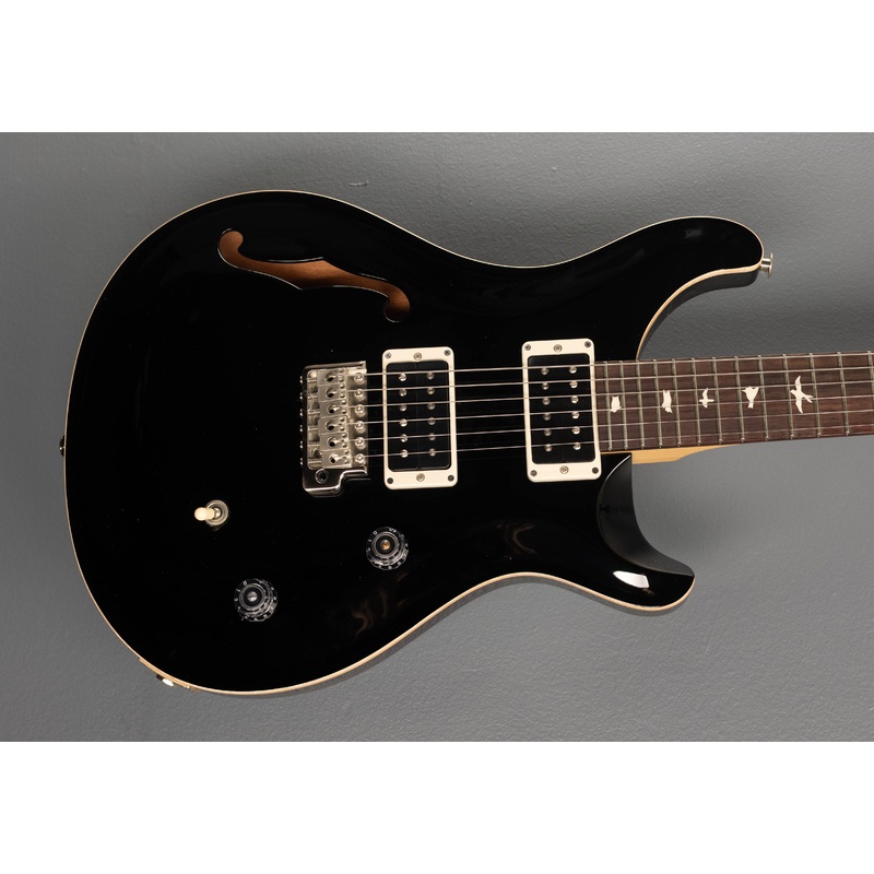 Very Good Condition, Black, Carved figured Maple top with the single F hole, Semi-hollow Mahogany body, Pattern Thin carved Maple neck, 10" radius Rosewood fingerboard with the Bird inlays, 25" scale length, 1 11/16th nut width, PRS 85/15 bridge and neck p