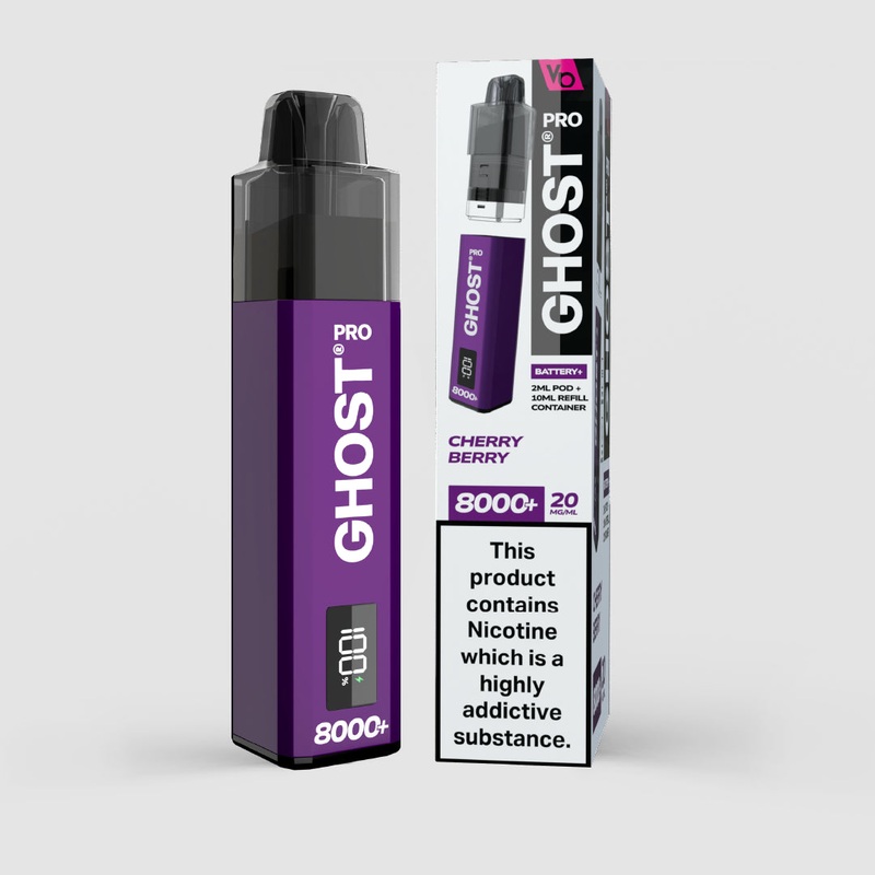 SOLD ONLY IN THE UK. Ghost Pro 8000+ Cherry Berry is a rich mix of ripe cherries and juicy berries. Sweet, tangy, and bursting with flavour. Upgraded version of the popular Ghost Pro 6000+, now with Removable pods extended vaping up to 8000 puffs.