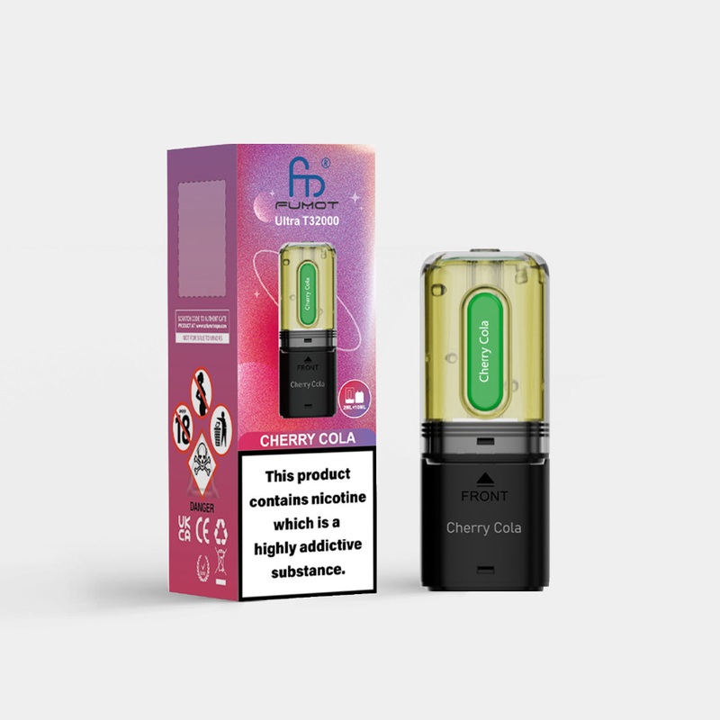 Fumot Ultra T32000 Pods Cherry Cola Enjoy up to 16,000 puffs of vibrant flavour. Each pod includes 2ml + 10ml of e-liquid, fusing juicy cherries with classic cola for a fizzy, nostalgic twist.