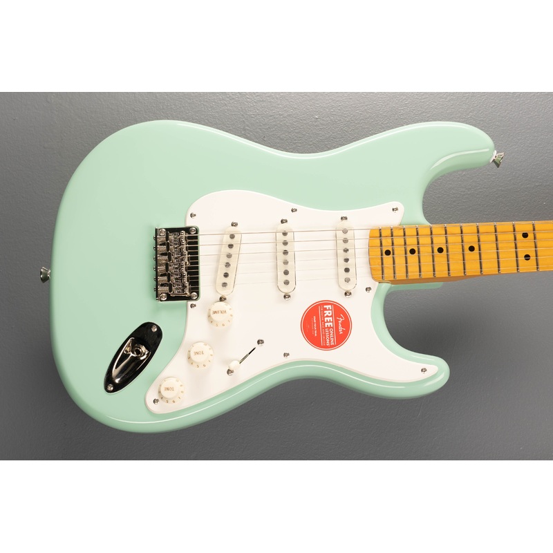 Surf Green, Poplar body, 9.5″ radius Maple fingerboard with dot inlays and Narrow Tall frets on a C shaped Maple neck, 25.5″ scale length, 1.650″ nut width, Fender Designed Alnico Single-Coil pickups with 5 way switching, 6-Saddle String-Through-Body Hardtail Bridge with Bent Steel Saddles, Vintage-Style tuners, 7.1 pounds, case not included.