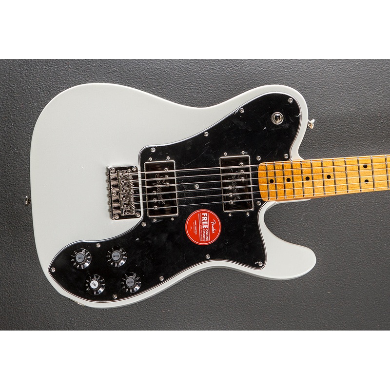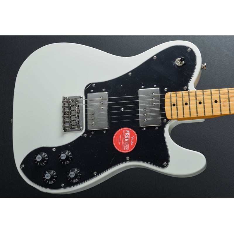 “The Classic Vibe 70s Telecaster Deluxe is a faithful nod to the 1970s evolution of the Tele, creating massive tone courtesy of the dual Fender-Designed Wide Range humbucking pickups. Player-friendly features include a slim, comfortable C-shaped neck profile with an easy-playing 9.5-radius fingerboard and narrow-tall frets, as well as a vintage-style Telecaster bridge with a string-through-body design and individual steel saddles for precise adjustment. This throwback Squier model also features 1970s-inspired headstock markings, rich-looking nickel-plated hardware and a slick vintage-tint gloss neck finish for an old-school vibe.”