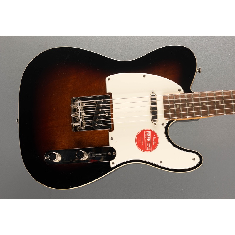 3 Color Sunburst, Crafted in Indonesia, Double bound Nyatoh body, Gloss polyurethane body finish, C shaped Maple neck with a 9.5 radius Indian Laurel fingerboard and narrow tall frets, 27″ scale length, 1.650″ nut width, Fender designed Alnico single coil Tele bridge and neck pickups, 3-way switching with the master volume and tone controls, Vintage style string thru body Tele bridge with the three chrome barrel saddles, Vintage style tuners, 7.1 pounds, Case not included