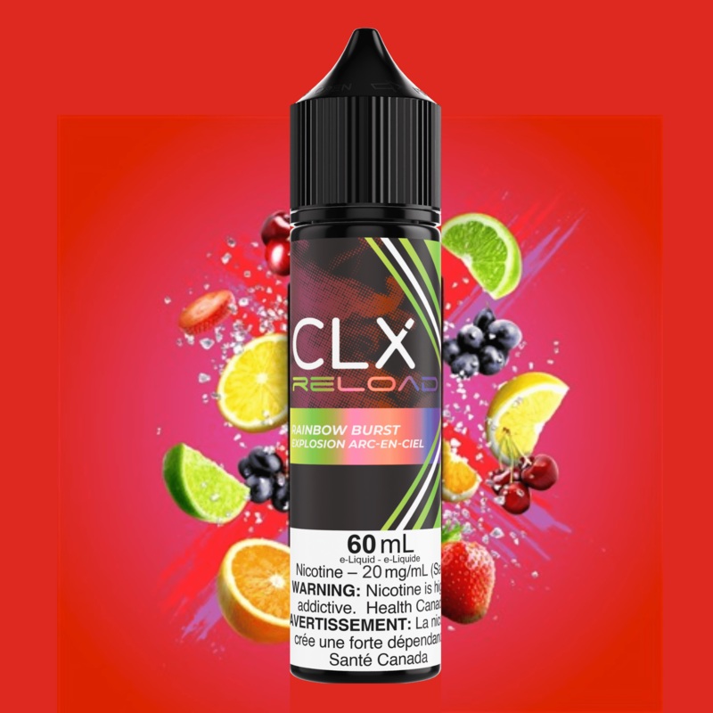 Shop CLX Reload 60ml Salt Rainbow Burst flavor is a handful of the rainbow with all the summer fruits mixed together with a burst of tangy sweetness. CLX Reload Saltis a Canadian Made collection by Dvine Labs who are also the creators of Maverick & Radical