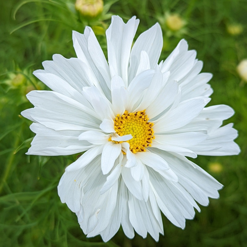 Cosmos bipinnatus D'un blanc pure avec des fleursavec des ptales qui se chevauchent au creux d'uncentre touffu, ce qui donne l'apparence de fleurs semi doubles. Les bordures des ptales sont en zigzags ce qui leur donne de petits plis tout fins, comme de la
