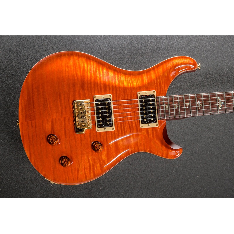 Orange, Gloss finish, Violin carved Flame Maple 10 top, Mahogany body, Wide/Fat carved Mahogany neck, 10" radius Rosewood fingerboard with the Bird inlays, 25" scale length, 1 11/16th" nut width, PRS Dragon bridge and neck pickups, 5-way rotary switching w
