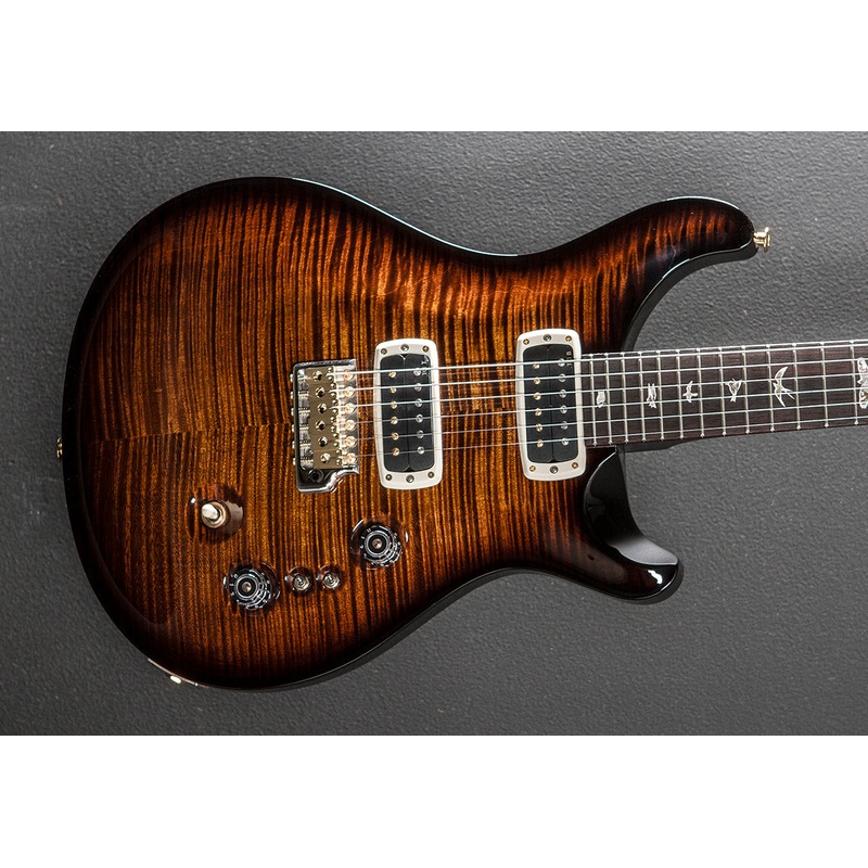 Black Gold Wraparound Burst, High gloss nitro finish, Violin carved Flame Maple 10 top, Mahogany body, Pattern Thin carved Mahogany neck, 10″ radius Rosewood fingerboard with the Bird inlays, 25″ scale length, 1 11/16th” nut width, PRS TCI bridge and neck pickups, 3-way toggle switching with the volume and tone controls plus the two mini-toggle EQ switches, PRS Gen III tremolo, PRS Phase III locking tuners with the wing buttons, 7.2 pounds, With hardshell case