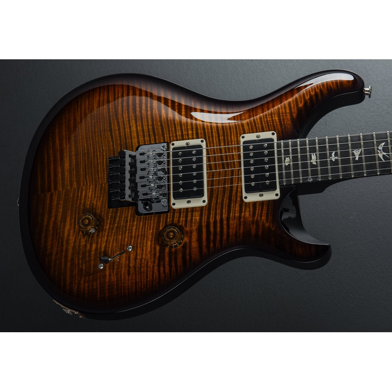 “The Custom 24 “Floyd” is equipped with the time-tested Floyd Rose “Original” tremolo system and PRS’s \ m / (metal) pickups. The Floyd Rose “Original” tremolo and locking nut tuning system is a double-locking design precision-made from high quality steel. This design combination allows players to lock the string at the nut and at the bridge to keep the guitar in tune even during the heaviest dive-bombing sessions.