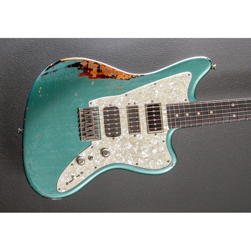 In-Distress Double Decker Metallic Sage Green over 3 Color Burst, Serial number 05-14-25A, Mahogany body, Even taper+.120 (.92" to 1.00") shaped Mahogany neck with a 12 to 14" compound radius Blackheart fingerboard, Stainless steel medium jumbo frets, 24.7