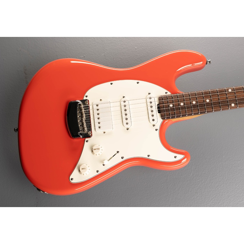 Very Good condition, Fiesta Red, High gloss polyester body finish, Alder body, Soft V shaped Maple neck, 10″ radius Rosewood fingerboard with the high profile/medium width stainless steel frets, 25.5″ scale length, 1 5/8th” nut width, The neck thickness is .82 at the first and .93 at the 12th frets, Music Man custom humbucking bridge and Music Man custom wound single coil middle/neck pickups, Wide spectrum Music Man “Silent Circuit” that reduces hum and retains a true single coil sound, 5-way switching with the master volume and tone controls plus a transparent buffered output for complete tonal consistency at all volume levels, Music Man modern tremolo with the vintage bent steel saddles, Schaller M6-IND locking tuners, 7.7 pounds, With the Ernie Ball molded plastic hardshell case.