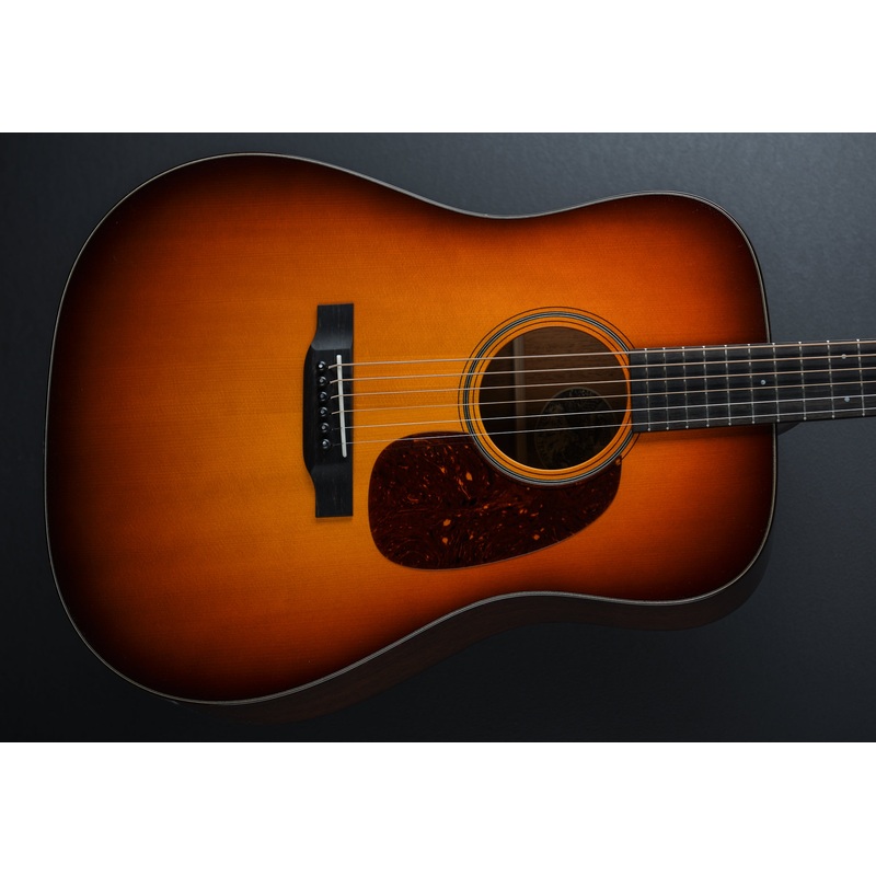 Sunburst, Serial number 34387, Square Shoulder 14 Fret Dreadnought body shape, High gloss nitrocellulose lacquer finish, Optional Adirondack Spruce top, Black/White purfling Rosette, Pre-war scalloped X bracing, Honduran Mahogany back and sides, 1 style Walnut backstrip, Tortoise binding with the b/w/b/w top purfling, Modified V shaped Honduran Mahogany neck, 14″ to 26″ compound radius Ebony fingerboard with the Mother of Pearl long Dot inlays and medium frets, 25.5 scale length, 1 11/16th nut width, Waverly tuners, 4.6 pounds, With hardshell case