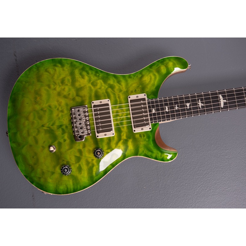 Eriza Verde, Violin carved Quilted Maple top, Mahogany body, Pattern Thin carved Maple neck, 10″ radius Ebony fingerboard with the Bird inlays, 25″ scale length, 1 11/16th nut width, PRS 57/08 covered bridge and neck pickups, 3-way toggle switching with the volume and push/pull coil tap tone controls, PRS patented molded tremolo and low mass locking tuners, 7.5 pounds, comes with Dave’s Guitar Shop 5th Anniversary truss rod cover (standard CE truss rod cover included) and PRS gig bag.