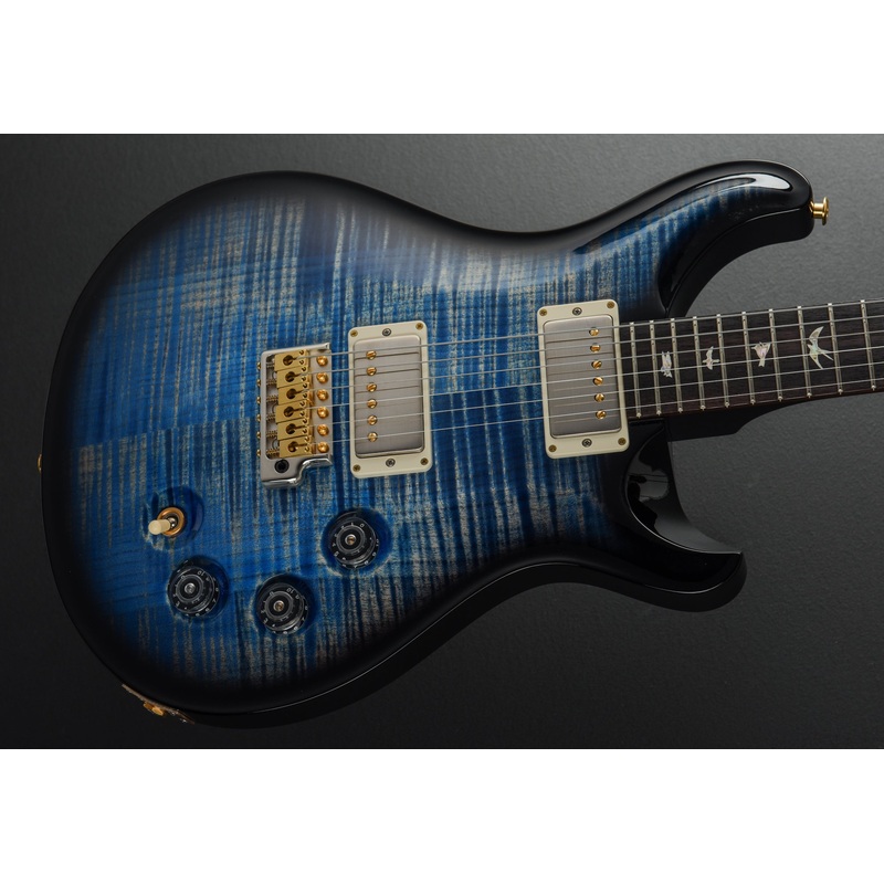 Blue Jean Wraparound Smoke Burst, High gloss nitro finish, Violin carved Flame Maple 10 top, Mahogany body, DGT carved Mahogany neck, 10″ radius Rosewood fingerboard with the Bird inlays, 25″ scale length, 1 11/16th” nut width, PRS DGT bridge and neck pickups, 3-way toggle switching with the volume/volume and push/pull coil tap tone controls, PRS patented Gen III tremolo, PRS Phase III locking tuners with the faux Bone buttons, 7.95 pounds, With hardshell case