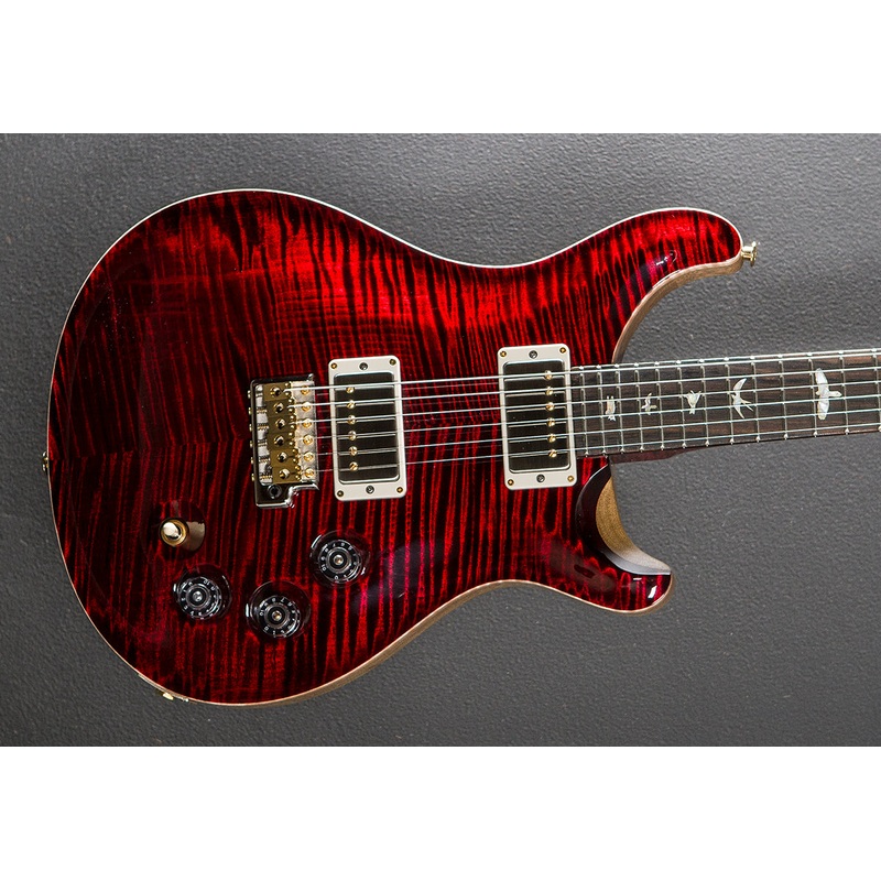 Red Tiger with the matching neck, High gloss nitro finish, Violin carved Flame Maple 10 top, Three piece Korina body, DGT carved figured Maple neck, 10" radius Ziricote fingerboard with the Gold Mother of Pearl outlined Mother of Pearl Bird inlays, 25" sca
