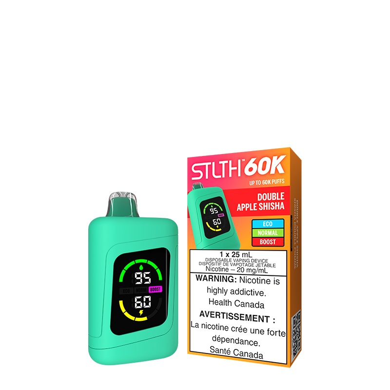 DOUBLE APPLE SHISHA STLTH 60K DISPOSABLEA bold mix of sweet red and tart green apples with a touch of traditional anise.______STLTH 60K - 3 MODES - ECO / NORMAL / BOOST 1 box contains 1 Disposable Device 25mL of E-Liquid Adjustable airflow RechargeableBatt
