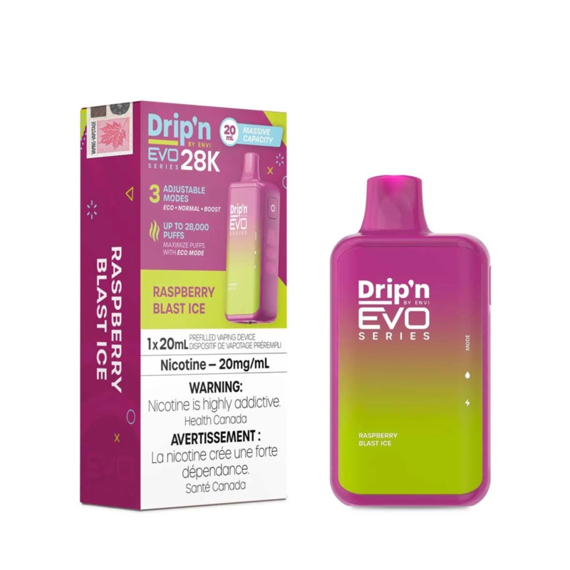 Flavour Notes: Raspberry Ice Dripn 28K EVO Series Features: Multiple Firing Modes: Eco Mode: Alternating Single Mesh Coil, 1.2 ohm, 9W Normal Mode: Alternating Single Mesh Coil, 1.2 ohm, 12W Boost Mode: Dual Mesh Coil, 0.6 ohm, 20W Battery: 850 mAh, Rechar