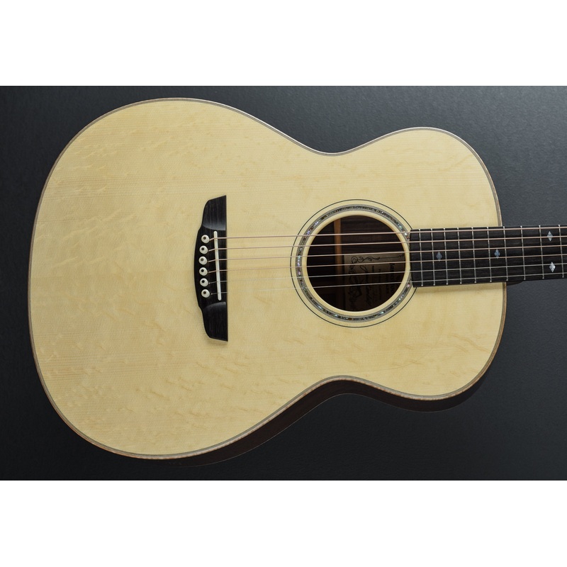 East Indian Grand Concert Guitar, 14 Fret 25.5″ scale 1.75″ nut width. East Indian Rosewood Back and sides. Curly Maple backstrip body and headstock binding. Master Grade German Spruce Top with “Bear Claw” figure. Abalone Rosette with Slotted Mother of Pearl Diamond Fretboard Inlay. Ebony: peghead veneer, fretboard, fretboard binding, bridge, & end pin. Bone bridge pins nut & saddle. Mahogany satin finish neck. Clear pickguard. Gotoh 510 Gold Mini Tuners w/mini Ebony Buttons 18:1 Ratio. Elixir Phosphor Bronze Nanoweb light gauge strings .012-.053. Includes Ameritage w/ Humidity control hardcase. Retail Price: $8700