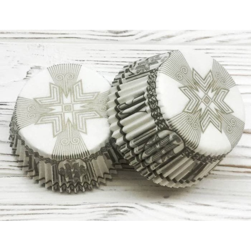 Easter XB design muffin/cupcake paper liner cups are 5×3 cm (2 in. base x 1.5 in. height). Set of 50, dark gold with XB Easter design. Made in Ukraine.
