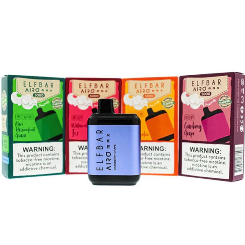 Elf Bar Airo Max DisposableBold 50! Elf Bar Airo Max Disposablekit features a whopping 5000 puffs and a50 Mg throat hit. The elf bar Airo Max is a special blend that gives you the 5% throat hit! The Elf Bar has amesh coil ensuring an even heating and optim