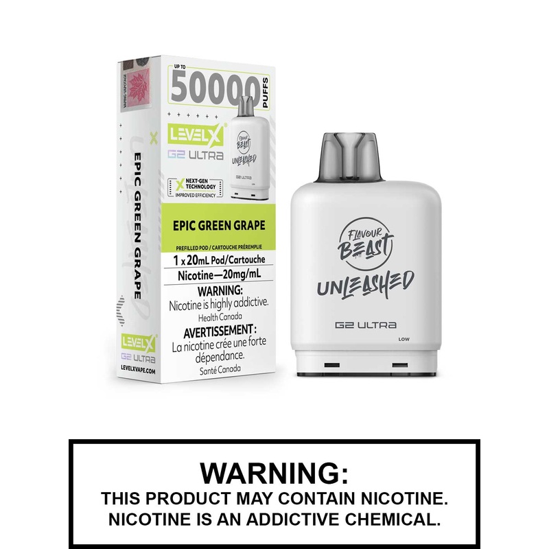 Push the limits of hybrid performance with the Epic Green Grape Flavour Beast Unleashed Level X Ultra Pods – a next-level upgrade in the Level X vape family. Engineered for extended use, each Ultra pod delivers up to 50,000 puffs with a 20mL vape juice capacity, offering serious longevity and bold flavour in every draw.