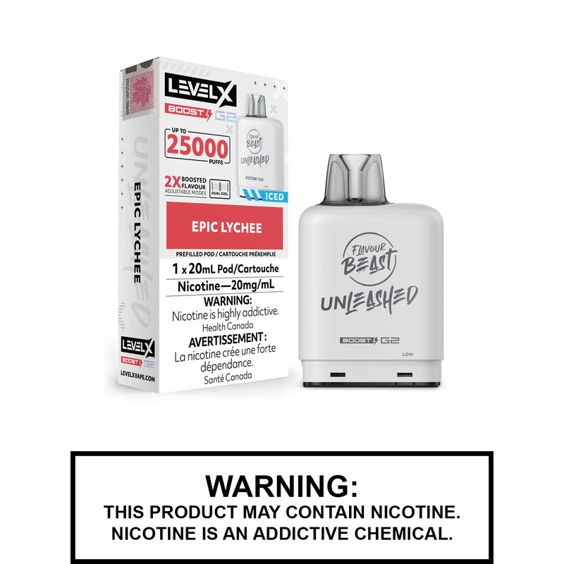 Introducing the Epic Lychee Iced Flavour Beast Unleashed Level X Boost G2 Pods, the latest innovation in the Level X family. These pods feature an impressive 20mL capacity, delivering up to 25,000 puffs and setting a new benchmark for Level X pods. Compatible with the Level X Boost battery and the new Level X Boost G2 battery, the Level X Boost G2 pods offer three distinct firing modes: Eco Mode for up to 25,000 puffs of smooth, subtle flavour; Standard Mode for up to 15,000 puffs of rich, flavourful hits; and Boost Mode for up to 10,000 puffs of intense flavour and cloud production.
