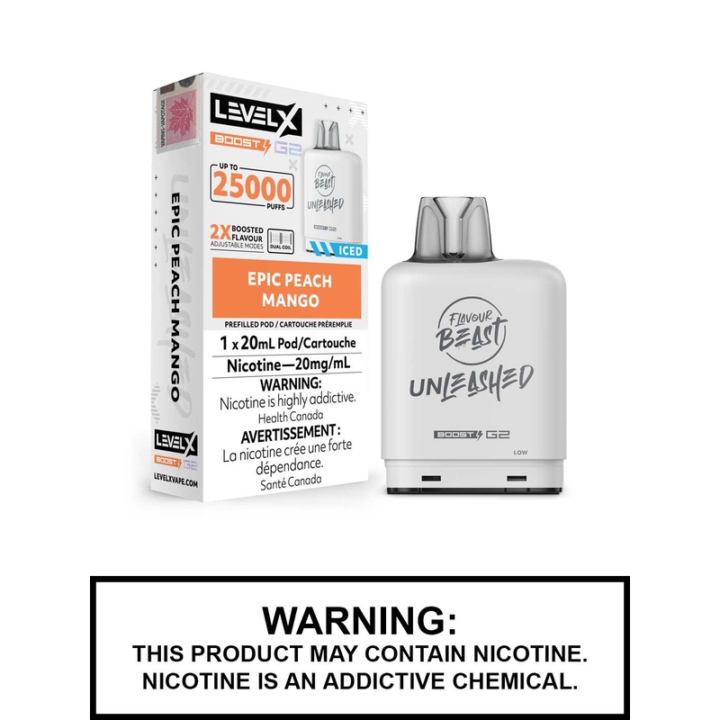 Introducing the Epic Peach Mango Iced Flavour Beast Unleashed Level X Boost G2 Pods, the latest innovation in the Level X family. These pods feature an impressive 20mL capacity, delivering up to 25,000 puffs and setting a new benchmark for Level X pods. Compatible with the Level X Boost battery and the new Level X Boost G2 battery, the Level X Boost G2 pods offer three distinct firing modes: Eco Mode for up to 25,000 puffs of smooth, subtle flavour; Standard Mode for up to 15,000 puffs of rich, flavourful hits; and Boost Mode for up to 10,000 puffs of intense flavour and cloud production.