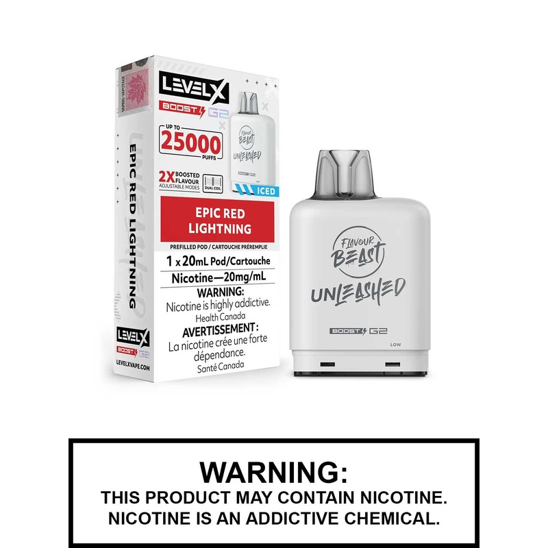 Introducing the Epic Red Lightning Iced Flavour Beast Unleashed Level X Boost G2 Pods, the latest innovation in the Level X family. These pods feature an impressive 20mL capacity, delivering up to 25,000 puffs and setting a new benchmark for Level X pods. Compatible with the Level X Boost battery and the new Level X Boost G2 battery, the Level X Boost G2 pods offer three distinct firing modes: Eco Mode for up to 25,000 puffs of smooth, subtle flavour; Standard Mode for up to 15,000 puffs of rich, flavourful hits; and Boost Mode for up to 10,000 puffs of intense flavour and cloud production.