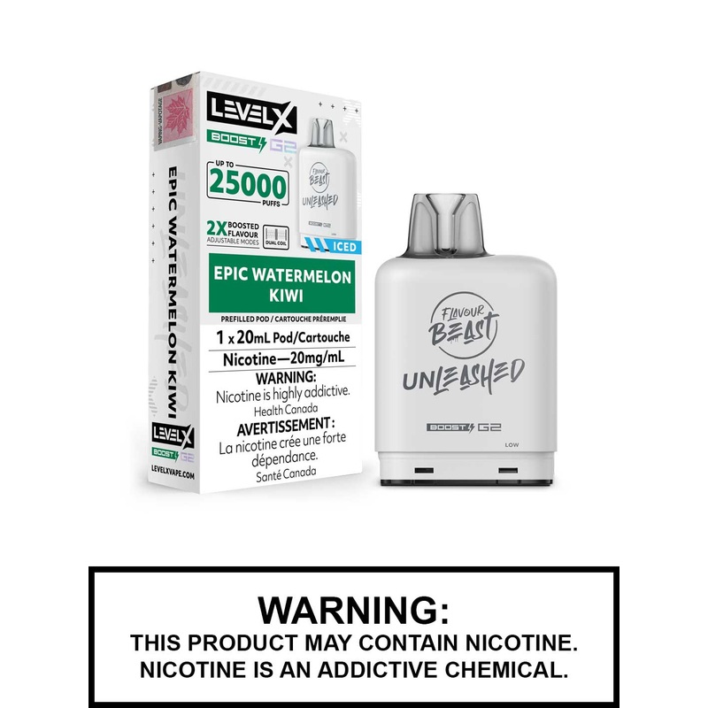 Introducing the Epic Watermelon Kiwi Iced Flavour Beast Unleashed Level X Boost G2 Pods, the latest innovation in the Level X family. These pods feature an impressive 20mL capacity, delivering up to 25,000 puffs and setting a new benchmark for Level X pods. Compatible with the Level X Boost battery and the new Level X Boost G2 battery, the Level X Boost G2 pods offer three distinct firing modes: Eco Mode for up to 25,000 puffs of smooth, subtle flavour; Standard Mode for up to 15,000 puffs of rich, flavourful hits; and Boost Mode for up to 10,000 puffs of intense flavour and cloud production.