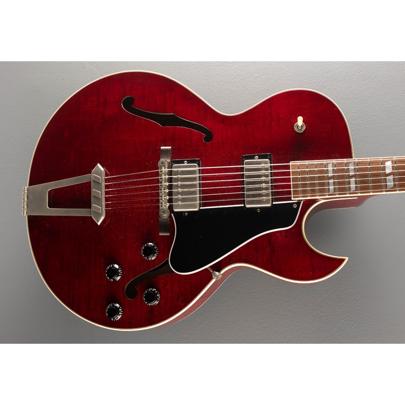 Vintage Cherry, Gloss nitrocellulose lacquer finish, Hollow laminated figured Maple body, Slim taper shaped Mahogany neck, Bound 12 radius Rosewood fingerboard with the parallelogram inlays and medium jumbo frets, 24.75″ scale length, 1 11/16th” nut width, Gibson ’57 Classic bridge and neck pickups, 3-way toggle switching with the volume and tone controls for each pickup, ABR-1 tune-o-matic bridge with the Rosewood base, Trapeze tailpiece and Gibson deluxe tuners, 7.0 pounds, With the original Gibson hardshell case